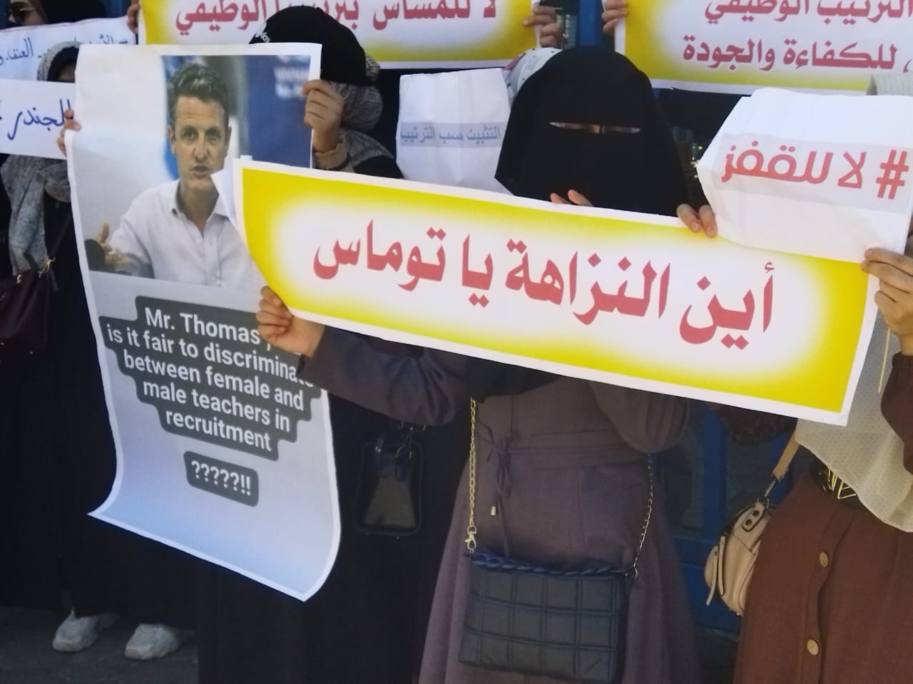 وتواصل المعلمات احتجاهن الذي بدأ في ٢٢ يونيو/حزيران المنصرم، للمطالبة بحل قضيتهن وتحقيق الأمان والاستقرار الوظيفي، وتنفيذ الوعود السابقة التي قطعها مدير الوكالة في غزة توماس وايت، حيث سبق وأكد أن التثبيت سيكون على أساس الكفاءة، حرصًا على جودة التعليم.