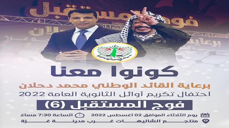 غزة: ينظم تيار الإصلاح الديمقراطي في حركة فتح، غدًا الثلاثاء، مهرجانًا مركزيًا لتكريم أوائل الثانوية العامة، في منتجع الشاليهات غرب مدينة غزة، برعاية القائد محمد دحلان.