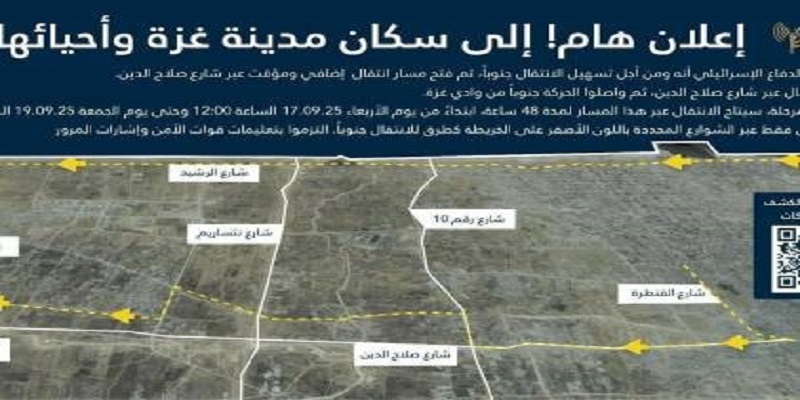 وتشير تقديرات جيش الاحتلال، إلى أن نحو 400 ألف من سكان غزة غادروا مدينة غزة حتى الآن.وفي هذه المرحلة، سيُفتح المعبر لمدة 48 ساعة فقط، بدءًا من الساعة 12 ظهرًا من يوم 17 سبتمبر/أيلول وحتى الساعة 12 ظهرًا من يوم 19 سبتمبر/أيلول. وجاء في الإعلان: "يرجى استخدام الشوارع المحددة على الخريطة فقط لعبور الاتجاه الجنوبي، والالتزام بالتعليمات .