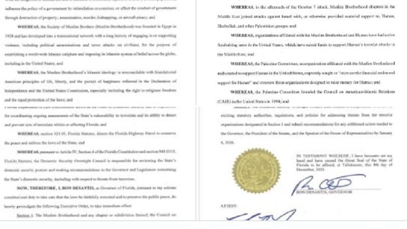 ويطلب الأمر من وكالات ولاية فلوريدا، منع المجموعتين وأي شخص قدم لهما دعماً مادياً، من الحصول على عقود أو وظائف أو أموال من أي وكالة تنفيذية أو وزارة حكومية بالولاية.